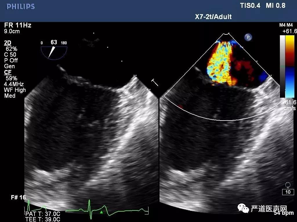 高龄老年男性患者,超声提示二尖瓣后瓣及前瓣脱垂伴重度反流,有明确临床症状,反复出现心衰临床表现,并具有多种合并症。经过讨论,该患者行传统外科手术风险较高,选择性微创ValveClamp治疗。围手术期经食道超声(TEE)确认二尖瓣退行性病变,前瓣后瓣A2/P2脱垂伴重度反流,脱垂区域宽度12mm,手术采用全麻左前胸3cm微创切口,通过心尖如路16F血管鞘完成,无需体外循环及心脏停跳,在TEE引导下准确将上海捍宇医疗创新研发的ValveClamp准确释放于A2/P2脱垂区域,行介入缘对缘(edge-to-edge)修复,整个手术过程顺利,植入时间仅25分钟,无明显失血,术后TEE提示二尖瓣反流即刻为极微量,二尖瓣双孔化形成,二尖瓣平均跨瓣压差仅为2mmHg,瓣口无狭窄,临床效果满意。